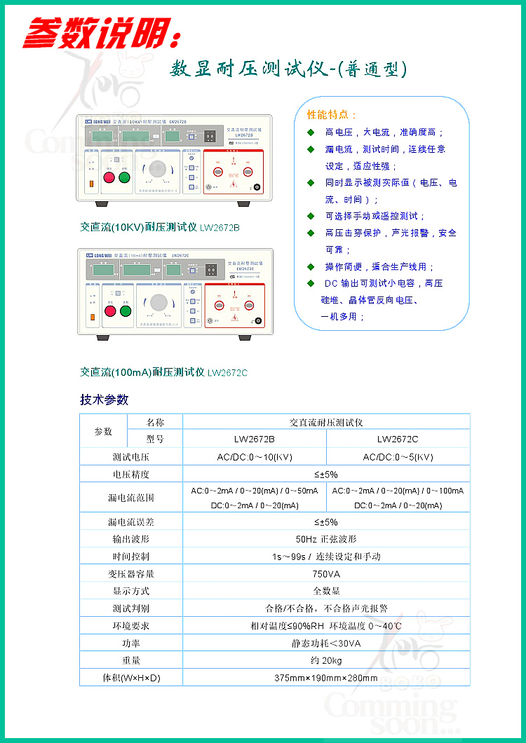 LW2672C交直流耐压测试仪5KV/10KV 2/20/50/100mA