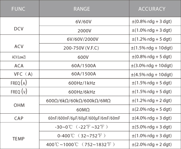 Full protection, anti-high-voltage ignition circuit design, streamlined design, high-definition dual-display screen, small body and jaws suitable for hand-held as well as reaching into the precisearea, low impedance voltage test, true RMS test, clamp head frequency measurement, large capacitance 60mF, temperature test, automatic shutdown, NCV test, torch illumination, inrush current, VFC current,