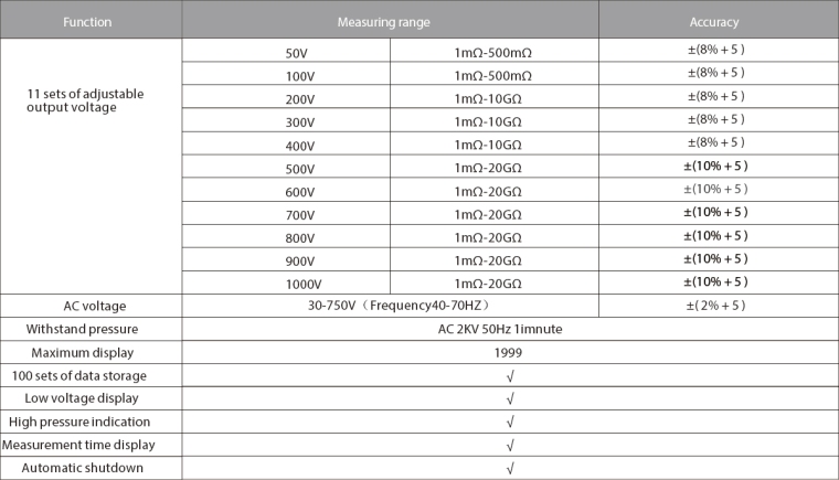绝缘电阻、交流电压、按键切换、数据存储、自动放电、自动关机、自动量程,高电压指示,测量时间,激活指数,吸收比,清晰度高背光等功能。
