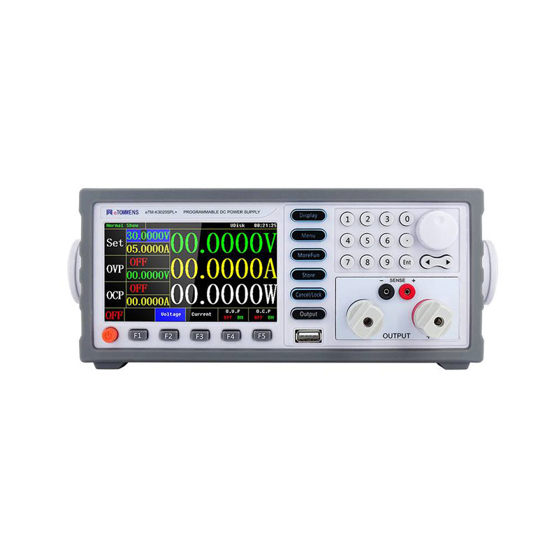 彩屏高精度程控开关电源采用4.3寸TFT彩色液晶显示,可以全面地显示电源的状态,高分辨率与高精确度,分辨率:1mV/1mA(5位)、0.1mV/0.1mA(6位);前置+后置双串口模式,方便开发人员与集成设备,前置USB接口同时支持开机换界面技术;TEST测试技术配合航空接口,方便快捷检测产品;后置BNC触发接口,可制定多种测试功能;标准2U高度机箱,可双机并排安装于机柜。方便且快速的操作与设定界面,高速调节旋钮和数字按键输入;内置蜂鸣器作为提示或警告;100 组设定储存与调出功能,可存储/调用 100 组电压电流等数据;远程感应实现补偿负载线的压降,精度更高。过载,极性接反保护,过压保护,过流保护,过温度保护,一键锁定功能,有效防止误操作;标配 RS232 接口,支持 SCPI 和 MODBUS 编程指令集;广泛应用于产品老化维修,电池充电、实验测试、生产测试、电解电镀等行业。