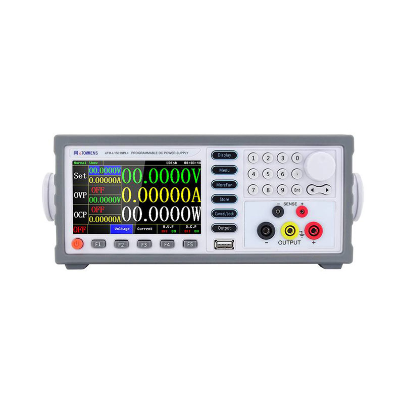 彩屏高精度程控线性电源采用4.3寸TFT彩色液晶显示,可以全面地显示电源的状态,高分辨率与高精确度,分辨率:0.1mV/0.1mA(5位)、0.01mV/0.01mA(6位);采用高品质纯铜环型变压器,纹波小,稳定性高;采用高品质纯铜环型变压器,纹波小,稳定性高;前置+后置双串口模式,方便开发人员与集成设备,前置USB接口同时支持开机换界面技术;TEST测试技术配合航空接口,方便快捷检测产品;后置BNC触发接口,可制定多种测试功能;标准2U高度机箱,可双机并排安装于机柜。方便且快速的操作与设定界面,高速调节旋钮和数字按键输入;内置蜂鸣器作为提示或警告;100 组设定储存与调出功能,可存储/调用 100 组电压电流等数据;远程感应实现补偿负载线的压降,精度更高。过载,极性接反保护,过压保护,过流保护,过温度保护,一键锁定功能,有效防止误操作;标配 RS232 接口,支持 SCPI 和 MODBUS 编程指令集;广泛应用于产品老化维修,电池充电、实验测试、生产测试、电解电镀等行业。