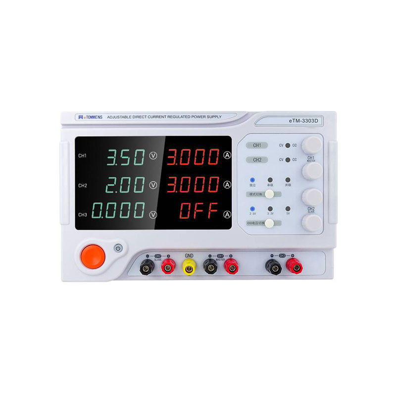 多路稳压稳流电源有两路可调输出、一路固定输出2.5V/3.3V/5V; 采用纯铜环型变压器,效率高,发热小。无须外接连线即可实现主通道CH1、CH2间的串并联,简化连线,使测试更简便。四位数码屏显示,具备10mV/1mA高精度分辨率,同时具备多种保护功能;一键控制输出通断开关,方便安全。广泛应用于产品老化维修,电池充电、实验测试、生产测试、电解电镀等行业。