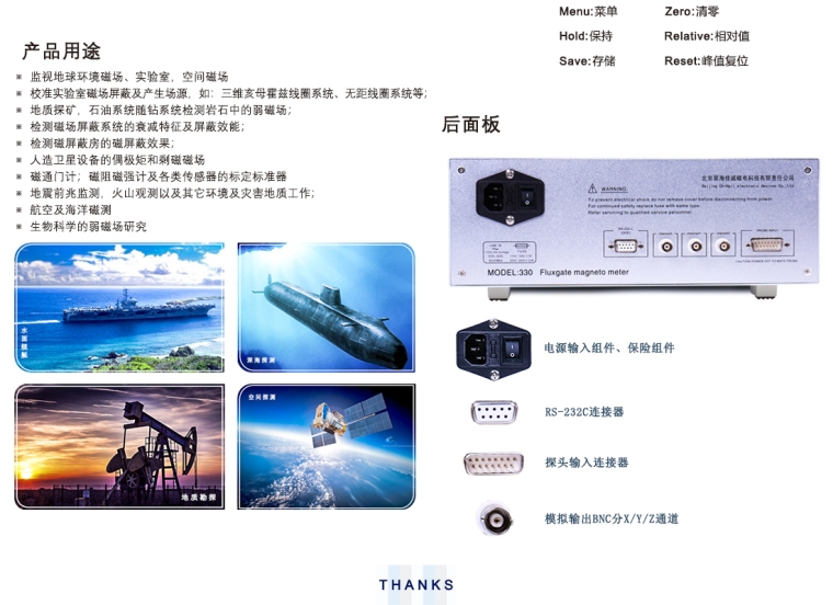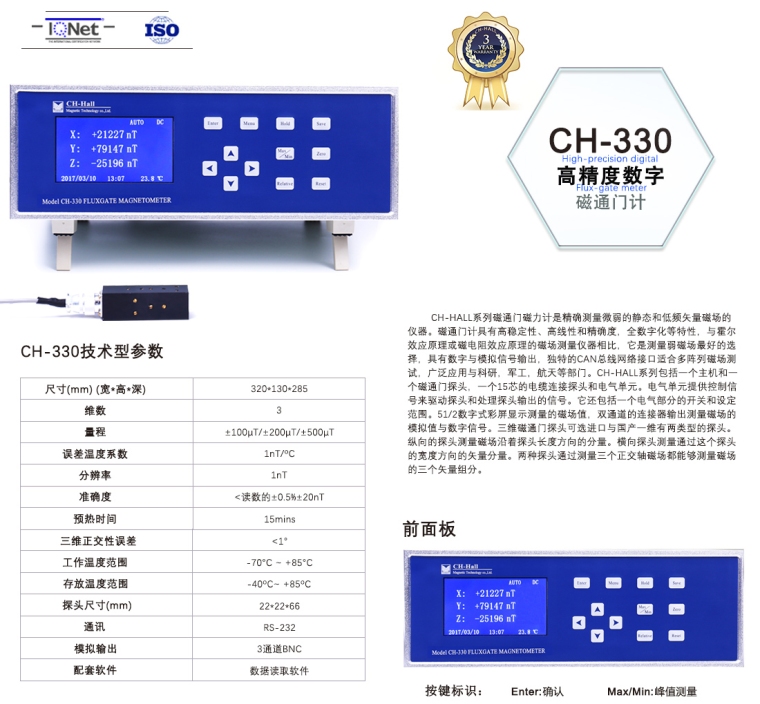 CH-HALL系列磁通门计是精确测量微弱的静态和低频矢量磁场的仪器。磁通门计具有高稳定性、高线性和精确度,全数字化等特性,与霍尔效应原理或磁电阻效应原理的磁场测量仪器相比,它是测量弱磁场***选择,具有数字与模拟信号输出,独特的CAN总线网络接口适合多阵列磁场测试,广泛应用于科研,**,航天等部门