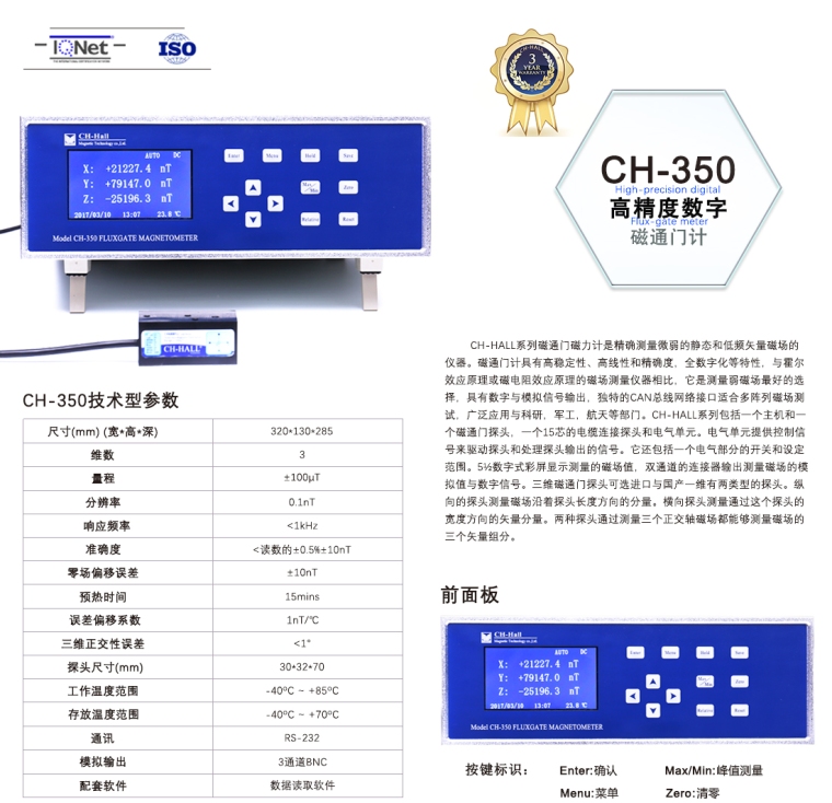 CH-HALL系列磁通门计是精确测量微弱的静态和低频矢量磁场的仪器。磁通门计具有高稳定性、高线性和精确度,全数字化等特性,与霍尔效应原理或磁电阻效应原理的磁场测量仪器相比,它是测量弱磁场***选择,具有数字与模拟信号输出,独特的CAN总线网络接口适合多阵列磁场测试,广泛应用与科研,**,航天等部门。