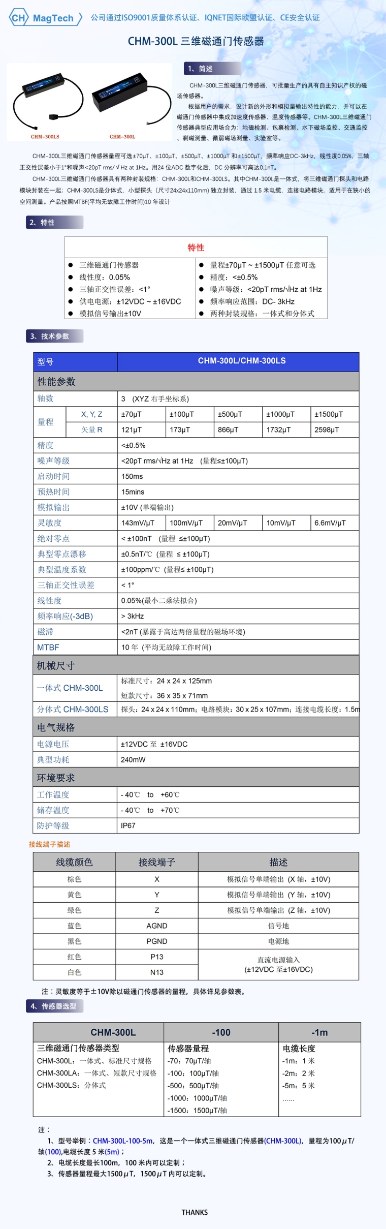 CHM-300L三维磁通门传感器,可批量生产的具有自主知识产权的磁场传感器。根据用户的需求,设计新的外形和模拟量输出特性的能力,并可以在磁通门传感器中集成加速度传感器、温度传感器等。CHM-300L三维磁通门传感器典型应用场合为:地磁检测、包裹检测、水下磁场监控、交通监控、剩磁测量、微弱磁场测量、实验室等。