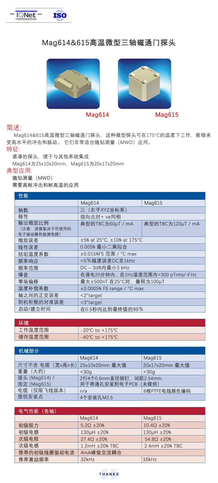 Mag614&615高温微型三轴磁通门探头,这种微型探头可在175°C的温度下工作,能够承受高水平的冲击和振动。它们非常适合随钻测量(MWD)应用。
