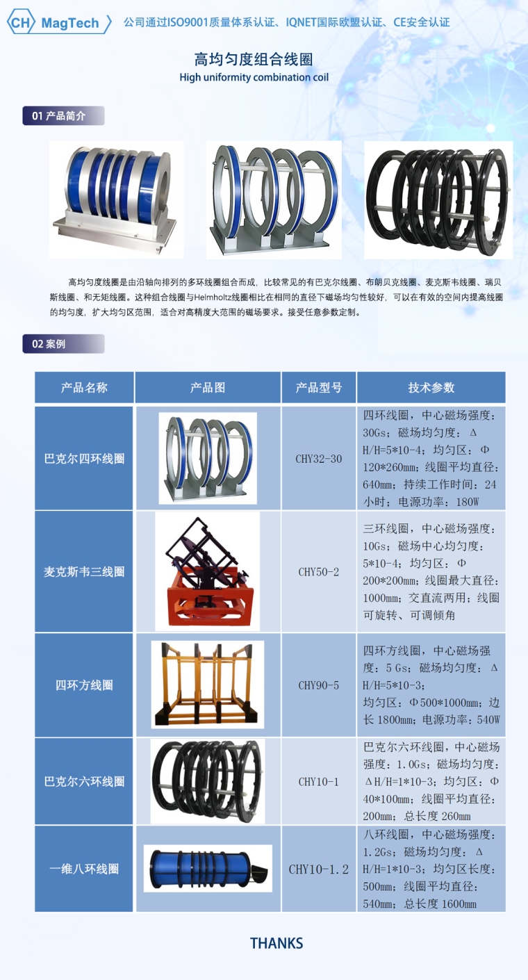 高均匀度线圈是由沿轴向排列的多环线圈组合而成,比较常见的有巴克尔线圈、布朗贝克线圈、麦克斯韦线圈、瑞贝斯线圈、和无矩线圈。这种组合线圈与Helmholtz线圈相比在相同的直径下磁场均匀性较好,可以在有效的空间内提高线圈的均匀度,扩大均匀区范围,适合对高精度大范围的磁场要求。接受任意参数定制。
