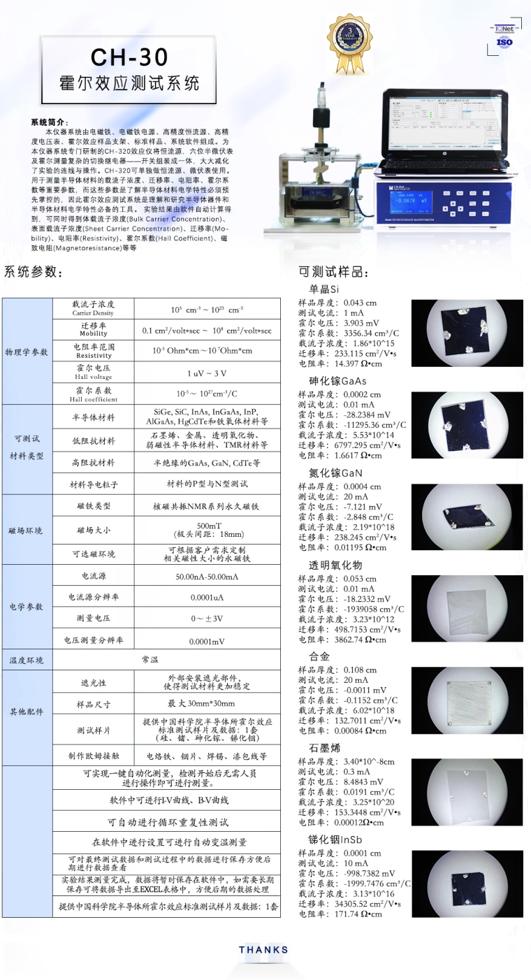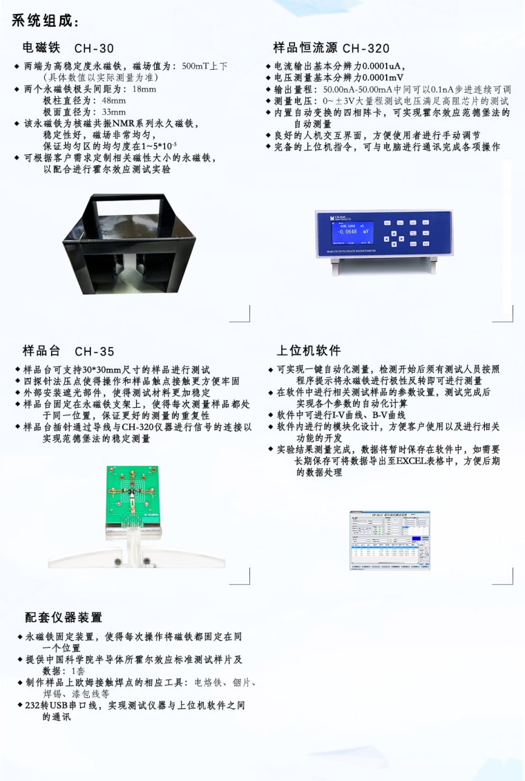 本仪器系统由永磁体、高精度恒流源高精度电压表、霍尔效应样品支架、标准样品、高精度高斯计和系统软件组成。为本仪器系统专门研制的CH-320效应仪将恒流源,六位半微伏表及霍尔测量复杂的切换继电器——开关组装成一体,大大减化了实验的连线与操作。CH-320可单独做恒流源、微伏表使用。用于测量半导体材料的载流子浓度、迁移率、电阻率、霍尔系数等重要参数,而这些参数是了解半导体材料电学特性必须预先掌控的,因此霍尔效应测试系统是理解和研究半导体器件和半导体材料电学特性必备的工具。 实验结果由软件自动计算得到,可同时得到体载流子浓度(Bulk Carrier Concentration)、表面载流子浓度(Sheet Carrier Concentration)、迁移率(Mobility)、电阻率(Resistivity)、霍尔系数(Hall Coefficient)、磁致电阻(Magnetoresistance)等等。