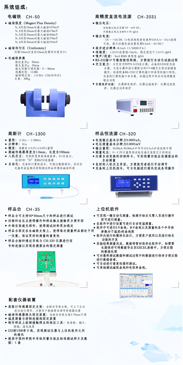 本仪器系统由电磁铁、连接电缆、高精度恒流源、高精度电压表、霍耳探头、标准样品、样品安装架、系统软件组成。为本仪器系统专门研制的CH-320效应仪将恒流源,六位半微伏表及霍耳测量复杂的切矩阵开关组装成一体,大大减化了实验的连线与操作。CH-320可单独做恒流源、微伏表使用。用于测量半导体材料的载流子浓度、迁移率、电阻率、霍尔系数等重要参数,而这些参数是了解半导体材料电学特性必须预先掌控的,因此霍尔效应测试系统是理解和研究半导体器件和半导体材料电学特性必备的工具。 实验结果由软件自动计算得到,可同时得到体载流子浓度(Bulk Carrier Concentration)、表面载流子浓度(Sheet Carrier Concentration)、迁移率(Mobility)、电阻率(Resistivity)、霍尔系数(Hall Coefficient)、磁致电阻(Magnetoresistance)等等。