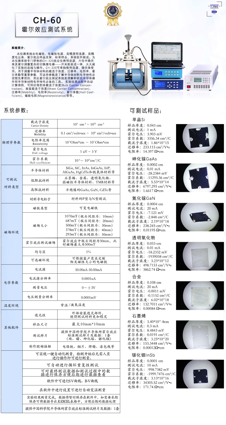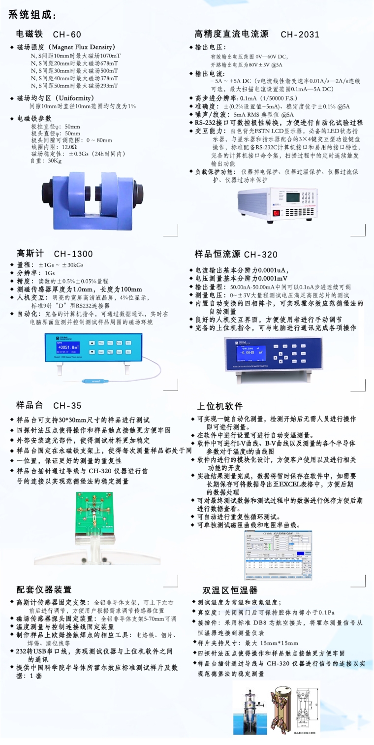 本仪器系统由电磁铁、电磁铁电源、高精度恒流源、高精度电压表、霍尔效应样品支架、标准样品、系统软件组成。为本仪器系统专门研制的CH-320效应仪将恒流源,六位半微伏表及霍尔测量复杂的切换继电器——开关组装成一体,大大减化了实验的连线与操作。CH-320可单独做恒流源、微伏表使用。用于测量半导体材料的载流子浓度、迁移率、电阻率、霍尔系数等重要参数,而这些参数是了解半导体材料电学特性必须预先掌控的,因此霍尔效应测试系统是理解和研究半导体器件和半导体材料电学特性必备的工具。 实验结果由软件自动计算得到,可同时得到体载流子浓度(Bulk Carrier Concentration)、表面载流子浓度(Sheet Carrier Concentration)、迁移率(Mobility)、电阻率(Resistivity)、霍尔系数(Hall Coefficient)、磁致电阻(Magnetoresistance)等等