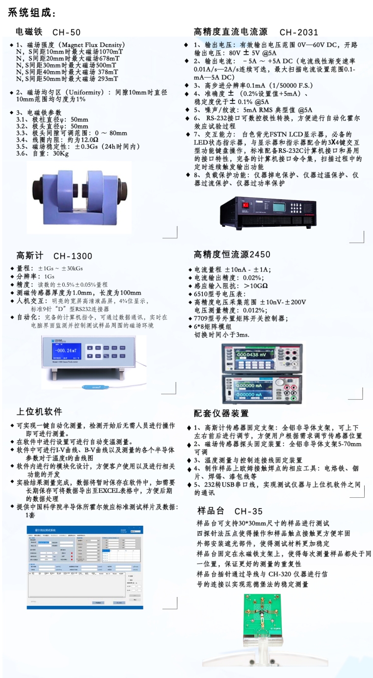 本仪器系统由电磁铁、电磁铁电源、高精度恒流源、高精度电压表、高精度源表、矩阵卡、霍尔效应样品支架、标准样品、系统软件组成。为本仪器系统专门研制的CH-320效应仪将恒流源,六位半微伏表及霍尔测量复杂的切换继电器——开关组装成一体,大大减化了实验的连线与操作。CH-320可单独做恒流源、微伏表使用。用于测量半导体材料的载流子浓度、迁移率、电阻率、霍尔系数等重要参数,而这些参数是了解半导体材料电学特性必须预先掌控的,因此霍尔效应测试系统是理解和研究半导体器件和半导体材料电学特性必备的工具。 实验结果由软件自动计算得到,可同时得到体载流子浓度(Bulk Carrier Concentration)、表面载流子浓度(Sheet Carrier Concentration)、迁移率(Mobility)、电阻率(Resistivity)、霍尔系数(Hall Coefficient)、磁致电阻(Magnetoresistance)等等。