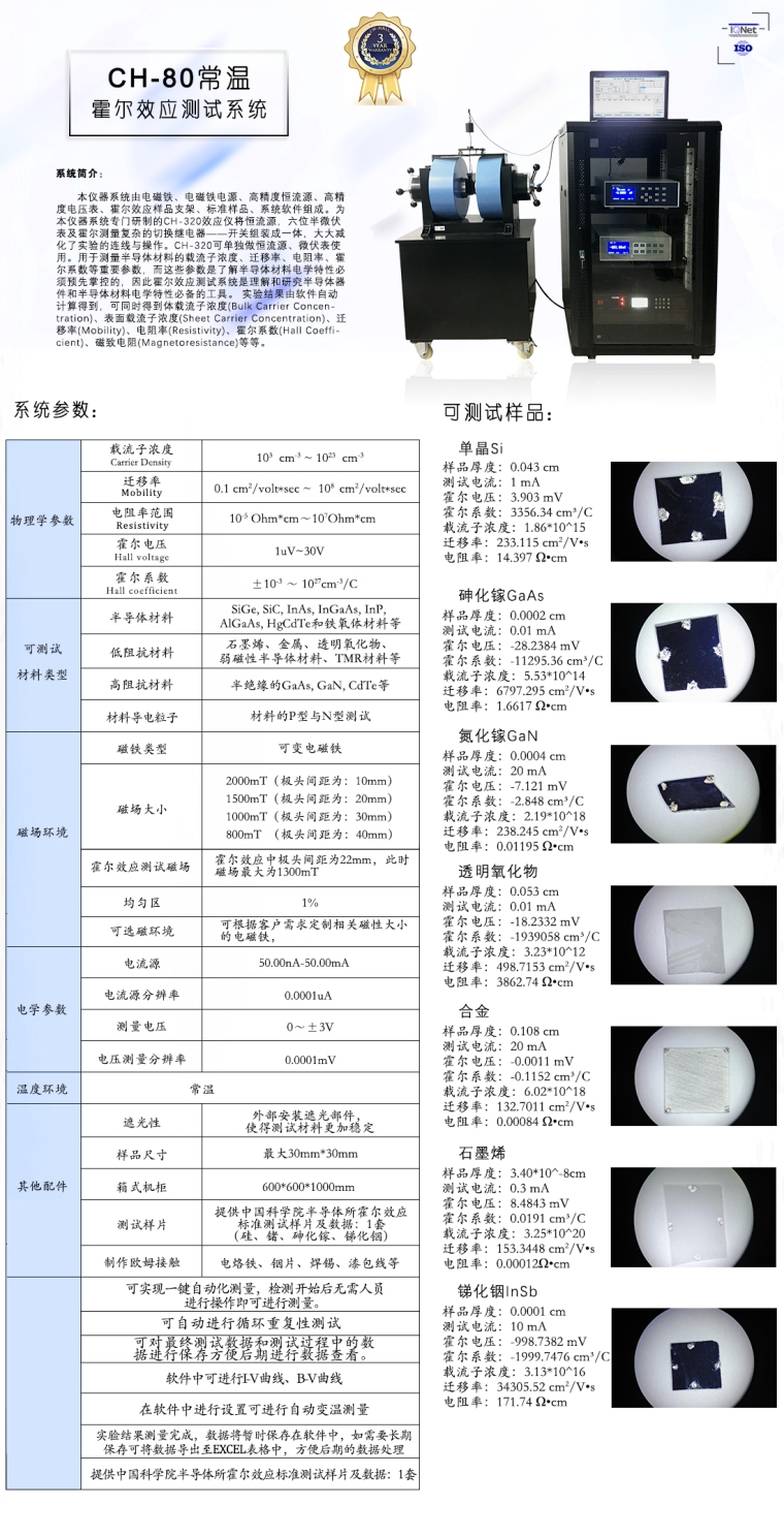 本仪器系统由可换向电磁铁、电磁铁电源、高精度恒流源、高精度电压表、霍尔效应样品支架、标准样品、系统软件组成。为本仪器系统专门研制的CH-320效应仪将恒流源,六位半微伏表及霍尔测量复杂的切换继电器——开关组装成一体,大大减化了实验的连线与操作。CH-320可单独做恒流源、微伏表使用。用于测量半导体材料的载流子浓度、迁移率、电阻率、霍尔系数等重要参数,而这些参数是了解半导体材料电学特性必须预先掌控的,因此霍尔效应测试系统是理解和研究半导体器件和半导体材料电学特性必备的工具。 实验结果由软件自动计算得到,可同时得到体载流子浓度(Bulk Carrier Concentration)、表面载流子浓度(Sheet Carrier Concentration)、迁移率(Mobility)、电阻率(Resistivity)、霍尔系数(Hall Coefficient)、磁致电阻(Magnetoresistance)等等。