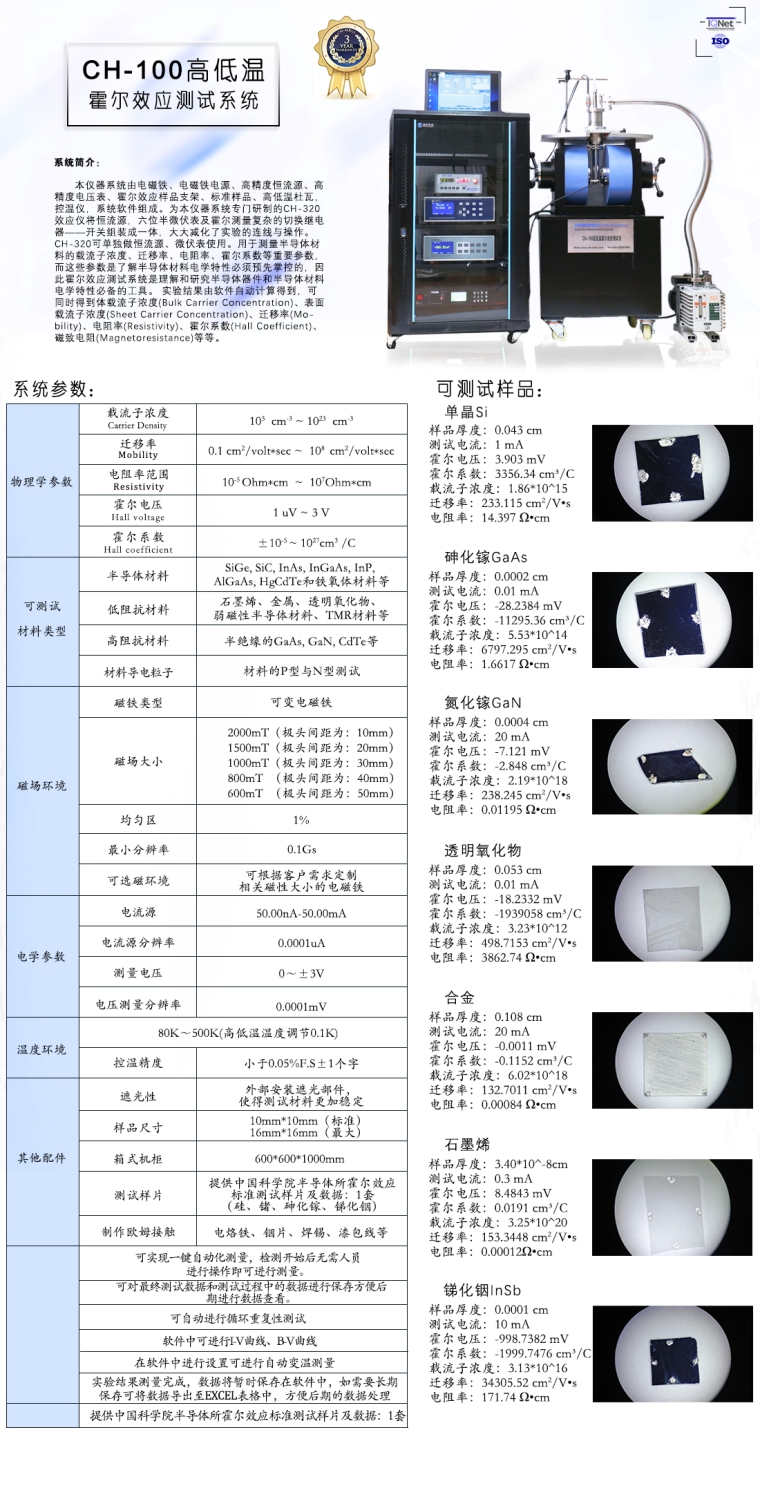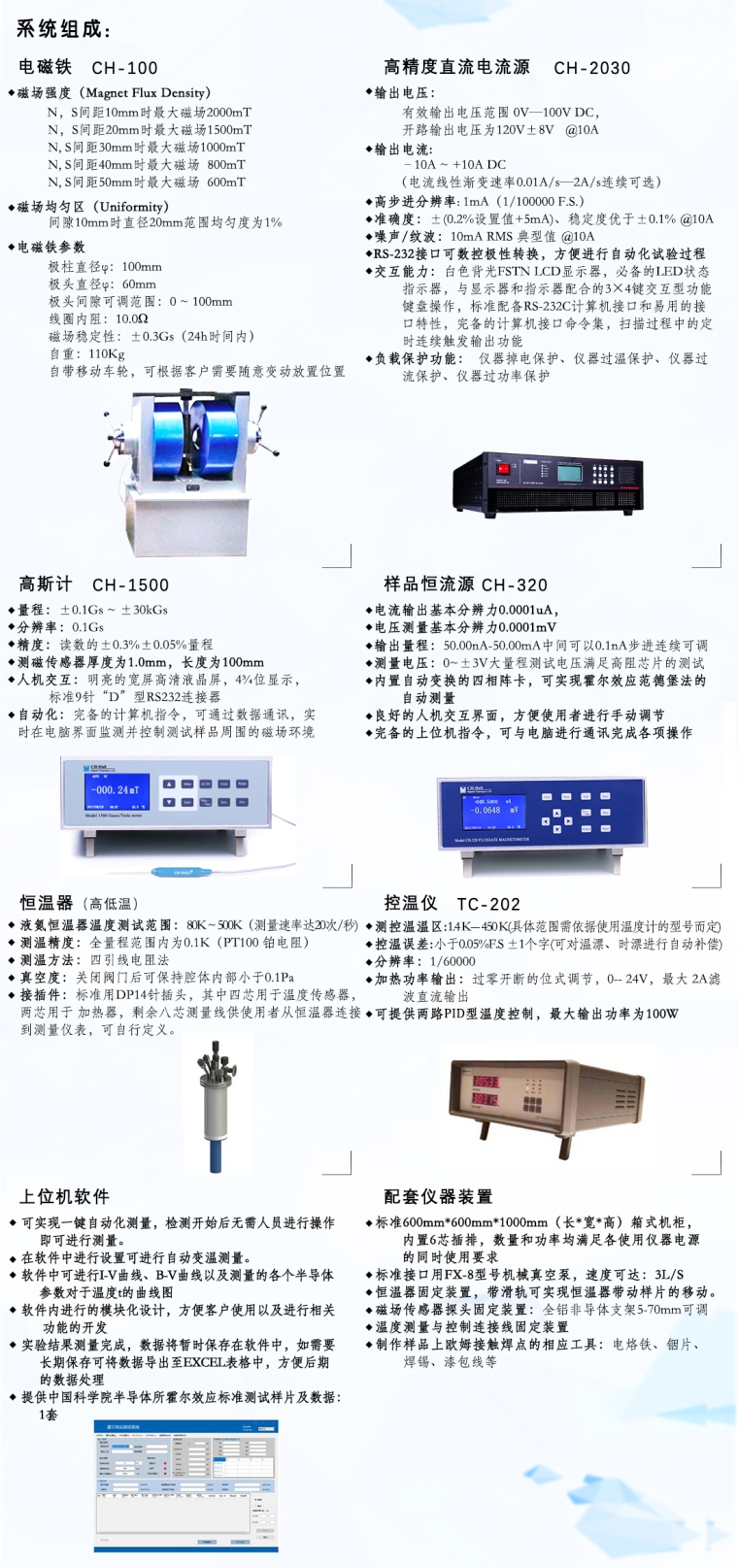 本仪器系统由电磁铁、电磁铁电源、高精度恒流源高精度电压表、霍尔效应样品支架、标准样品、高低温杜瓦,控温仪,系统软件。为本仪器系统专门研制的CH-320效应仪将恒流源,六位半微伏表及霍尔测量复杂的切换继电器开关组装成一体,大大减化了实验的连线与操作。CH-320可单独做恒流源、微伏表使用。用于测量半导体材料的载流子浓度、迁移率、电阻率、霍尔系数等重要参数,而这些参数是了解半导体材料电学特性必须预先掌控的,因此霍尔效应测试系统是理解和研究半导体器件和半导体材料电学特性必备的工具。 实验结果由软件自动计算得到,可同时得到体载流子浓度(Bulk Carrier Concentration)、表面载流子浓度(Sheet Carrier Concentration)、迁移率(Mobility)、电阻率(Resistivity)、霍尔系数(Hall Coefficient)、磁致电阻(Magnetoresistance)等等。
