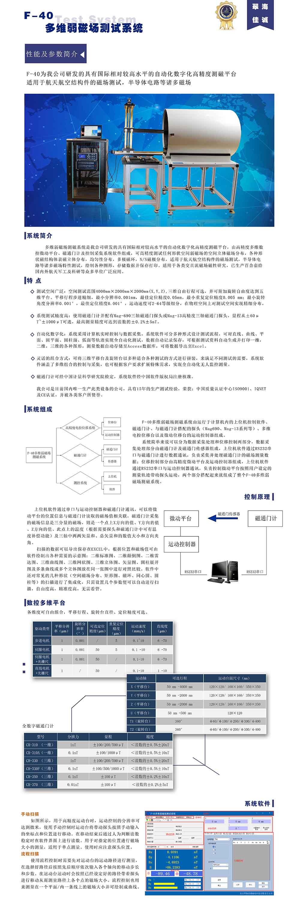 F-40为我公司研发的具有国际相对较高水平的自动化数字化高精度测磁平台适用于航天航空结构件的磁场测试,半导体电路等诸多磁场
