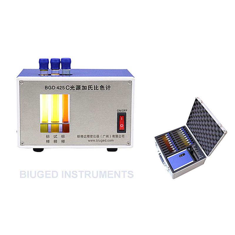 BGD 425 型C光源加氏比色计由一个装有符合CIE标准光源C的照明装置和18支标有号数的不同颜色标准的试管组成。测试时将待测样品样品置于仪器所配的玻璃管中,以目视法与不同号数的颜色标准试管在标准照明装置装置下比较,确定与样品最接近的颜色标准,结果以加氏颜色号数表示。