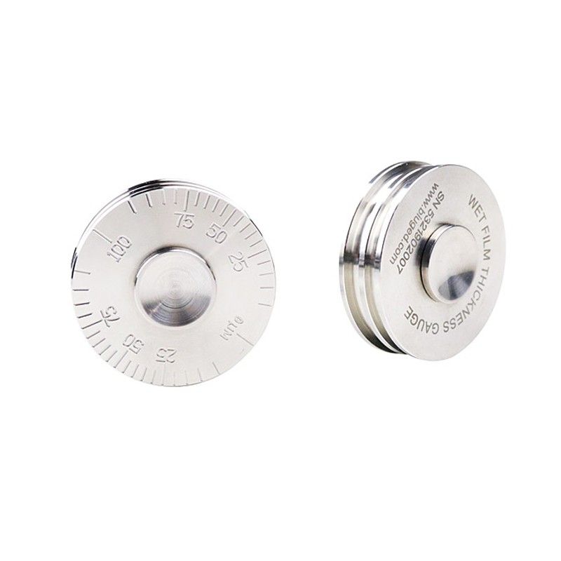 不锈钢材质。由一个轮子构成,轮子上有三个凸起的轮缘。两个轮缘具有相同直径且与轮子的轴呈同轴心安装。第三个轮缘直径较小且是偏心安装。外面的一个轮缘上有刻度,从该刻度上能读出相对于偏心轮缘凸起的各个距离。使用时用拇指和食指夹住滚轮中间的不锈钢手柄(转动灵活,方便清洁),将刻度表上读数最大处与表面接触而将同心轮缘按在试样表面上,沿一个方向滚动轮规,然后将轮规移走,读取偏心轮缘仍能被涂料润湿的最大刻度读数即为湿膜厚度,以μm表示。