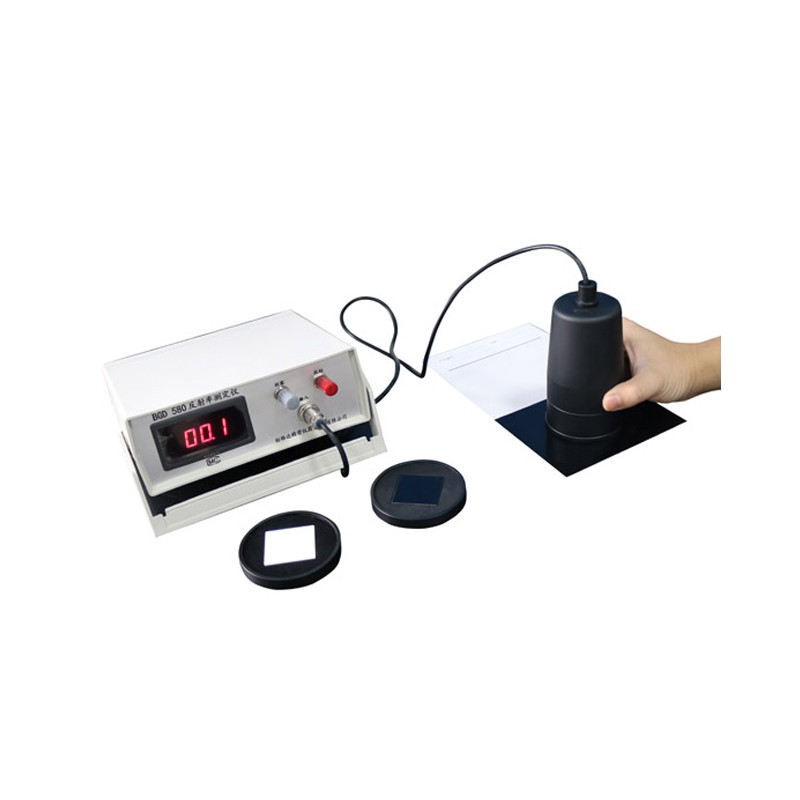 BGD 580 反射率测定仪符合GB/T 23981.1-2019《色漆和清漆 遮盖力的测定 第1部分:白色和浅色漆对比率的测定》中反射率法的要求,该仪器由探头、主机、标准板(黑白各一块)、工作陶瓷板(黑白各两块)等组成。探头采用0°照射、45º接收的原理,当试样的反射光作用于硒光电池表面时产生电信号输入直流放大器进行放大,并予以读数显示。仪器示值与受试表面反射光强度成正比。