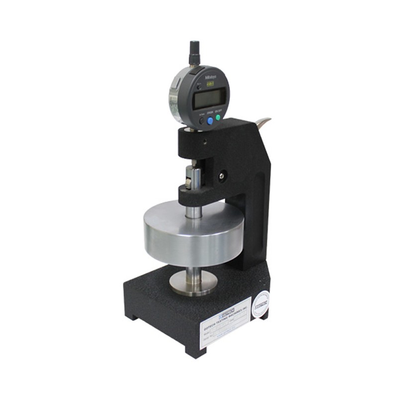 量测纸类、皮类、纺织类、鞋类等材料之厚度。将试件平置于两平行压盘之间(并加于一定荷重)通过千分表指示被测材料之厚度。