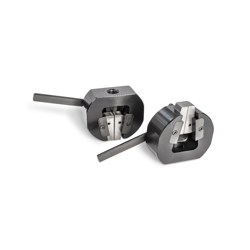 UTS Deluxe-Action 楔夹能通过T 型手柄拧紧样品上的钳口,让夹点钳口向上或向下移动。当样品滑出夹块的倾向时,有助于操作员在测试前更牢固地夹紧样品。测试圆形样品时,可互换的钳口会根据样品厚度或直径夹入夹持体。包括: