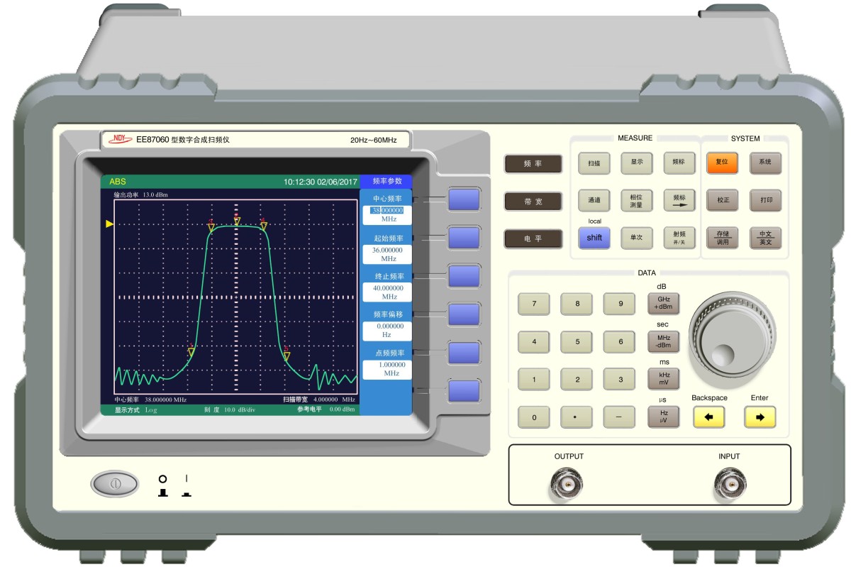 EE87060系列数字合成扫频仪采用直接数字合成技术,微处理器控制;内置检波器,无需检波探头;可完成20Hz~120MHz范围内任意一频率段的幅频特性的测量;扫频方式可任意设置,如线性、对数、点频等;可直接显示光标位置的频率值、幅度值。 6.4"TFT彩色液晶屏,视觉舒适,清晰度高;中文/英文菜单,操作方便;在扫频范围内可同时设置和显示五个光标;随机配置RS232接口,VGA(外接显示器)接口。可选配GPIB接口、USB接口,打印口。