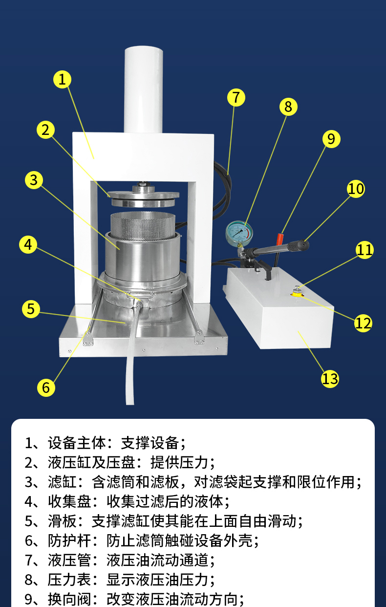 本压滤机设备滤筒与滤板的分离设计,巧妙的解决了滤饼难取出的问题,操作简便,安全可靠,作业周期极短是实验室代替抽滤设备利器。