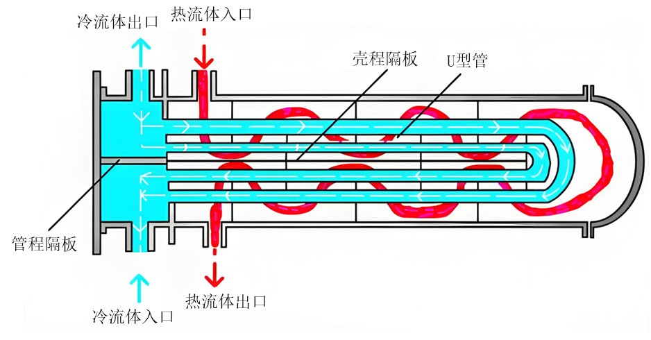 ③U型管式换热器 每根换热管皆弯成U形,两端分别固定在同一管板上下两区,借助于管箱内的隔板分成进出口两室。此种换热器完全消除了热应力,结构比浮头式简单,但管程不易清洗。